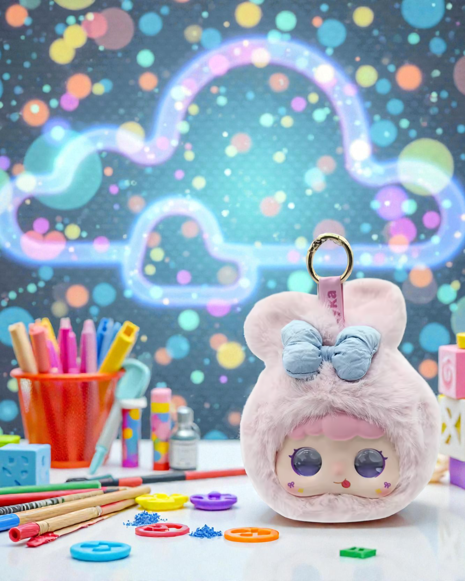 Le truc drôle : Sa petite langue est toujours sortie parce qu'elle vérifie toutes les deux minutes si son nœud est bien droit en essayant de le voir sans miroir (spoiler : elle n'y arrive jamais). Elle adore être accrochée à ton sac à main car elle se prend pour une garde du corps d'élite : elle surveille les environs avec ses grands yeux violets, mais elle s'endort dès qu'on marche un peu trop vite. C'est la seule lapine au monde qui préfère le shopping aux carottes !